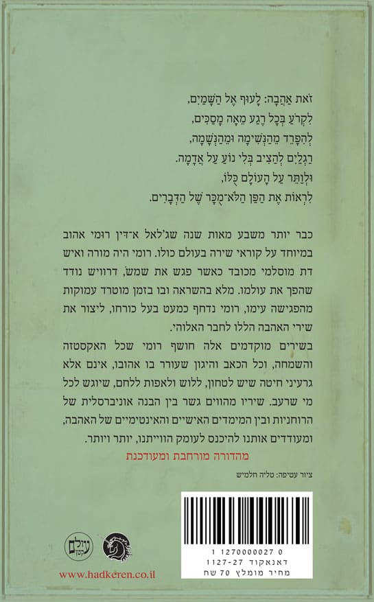 כבר יותר משבע מאות שנה שג'לאל א־דּין רוּמי אהוב במיוחד על קוראי שירה בעולם כולו. בשירים מוקדמים אלה חושף רומי שכל האקסטזה והשמחה, וכל הכאב והיגון אינם אלא גרעיני חיטה שיש לטחון, ללוש ולאפות ללחם, שיוגש לכל מי שרעב. שיריו מהווים גשר בין הבנה אוניברסלית של הרוחניות ובין המימדים האישיים והאינטימיים של האהבה, ומעודדים אותנו להיכנס לעומק הווייתנו, יותר ויותר.