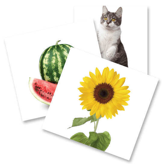 • 100 כרטיסיות בגודל 24X22.5 ס"מ עם תמונות בנושא טבע לפי הקטגוריות הבאות: סלעים, ירקות, עלים, פירות, אגוזים, ציפורים, תבלינים, פרחים, יונקים, חרקים.